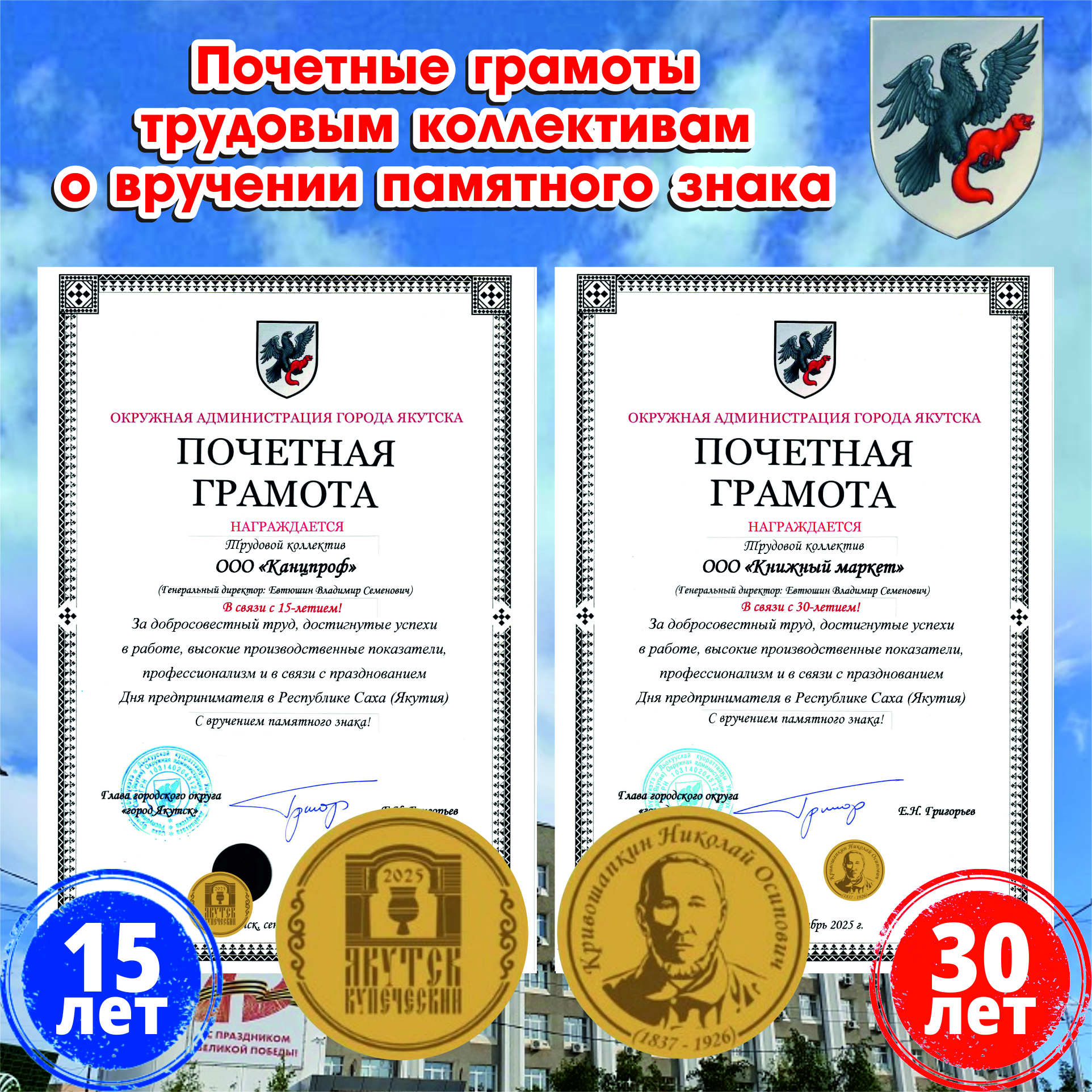 отмечены 🎖️ПОЧЕТНЫМИ ГРАМОТАМИ с памятным знаком “Якутск Купеческий”* от Окружной администрации города Якутска.